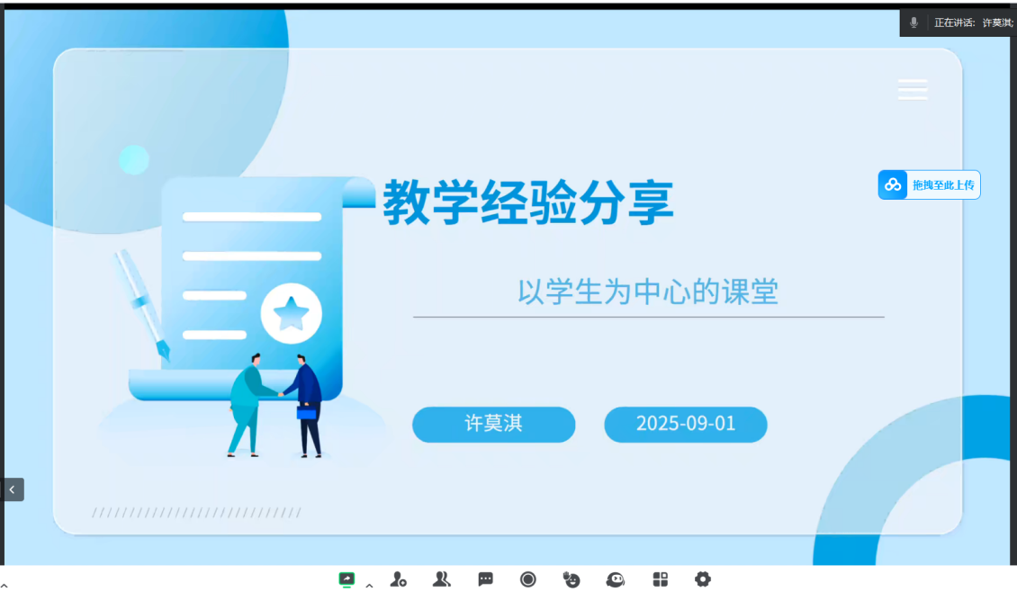 会议开始邀请黄炎培教学名师许莫淇老师分享了教学心得。许老师提出,教学工作的核心在于“以生为本”,教师首先要深入了解学生,根据学生的个体差异灵活调整教学策略,充分发掘学生的优势与潜力。在打造优质课堂方面,许老师强调需牢牢把握三大关键要点:教学目标明确精准、教学层次设计合理、教学节奏把控适宜。同时,她建议教师可借助AI技术生成分层教学任务,优化作业设计,提升教学效率与针对性。针对高职本科学生学习基础差异较大的特点,她建议教学过程中应更加注重成果产出,将抽象的理论知识与实际应用相结合,确保教学内容能兼顾不同层次学生的发展需求,让每位学生都能在学习中有所收获、有所成长。