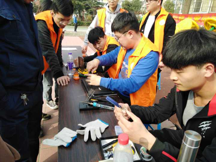 活动现场,志愿者们认真查找故障原因,仔细分析每一件小家电存在的问题,积极加以维修并做好登记工作。只见志愿者们熟练地拆卸、检测、换零件、重装、测试,三下五除二,一台台电脑、一个个手机就又可以正常工作了……闻讯赶来的居民陆续从家中拿来不能正常运转的手机、电脑等家用电器让同学们“会诊”维修。此外,参与志愿服务维修的志愿者们还耐心地向社区居民宣讲关于家电使用和保养的方法;对无法修好的电器认真地说明损坏原因,提供维修建议,将凝聚暖暖爱心的志愿服务活动由小小服务台逐渐辐射整个社区。