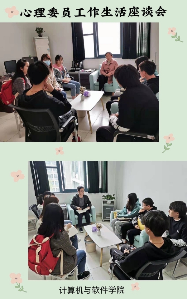为了更好地了解计算机与软件学院20级新生班级心理委员在学习和生活中的情况以及各班学生心理健康状况。辅导员张蕾老师和实习老师周易筱于2021年4月14日、15日两天下午2:00-4:00在敬业楼412开展了20级新生心理委员的工作生活座谈会。