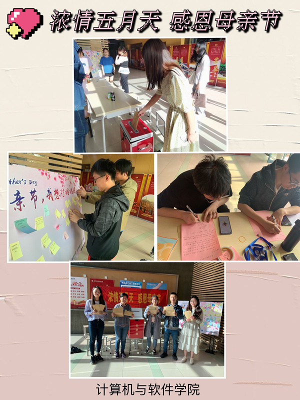 五月康乃馨,爱心献母亲,世界上有一种爱任你肆意的去索取,却不求回报,这种爱叫做母爱,母亲是太阳底下最光辉的形象。在母亲节到来之际,计算机与软件学院于2021年5月8日下午在敬业楼1楼开展了“浓情五月天,感恩母亲节”心理广场活动。同学们都积极报名,踊跃参加。
