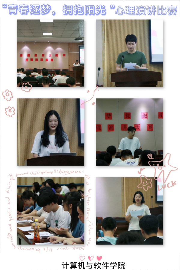 为了进一步加强我院的心理健康教育工作,推进学生心理素质的全面提升,鼓励同学们用演讲的形式讲出对心理的认识,让同学们更加关注心理健康,达到心理健康教育的目的,计算机与软件学院于2021年6月9日晚上19:00在敬业楼415举办了以“青春逐梦,拥抱阳光”为主题的演讲比赛。