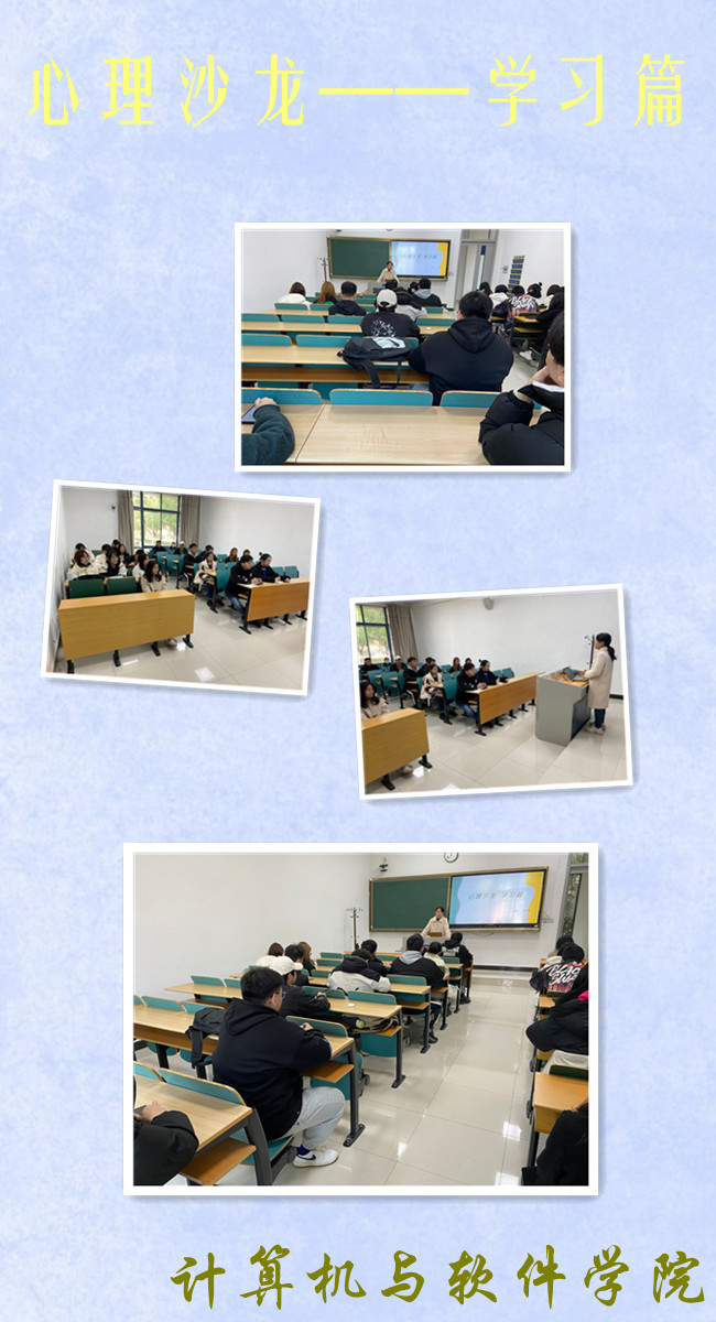 为了宣传和普及大学生心理知识,让同学们有正确的学习方法,以积极的态度面对学习带来的压力,学习如何化解学习带来的困难,计算机与软件学院于12月9日举办了以学习为主题的心理沙龙活动,向各班心理委员讲述如何给同学们开导学习带来的心理压力。