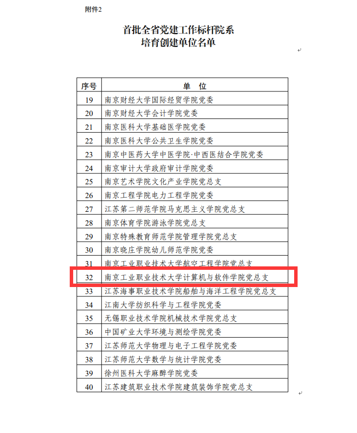 近日,江苏省委教育工委公布了首批培育建设8个全省党建工作示范高校、65个全省党建工作标杆院系和505个全省党建工作样板支部名单。学院成功入选全省党建工作标杆院系培育建设单位。