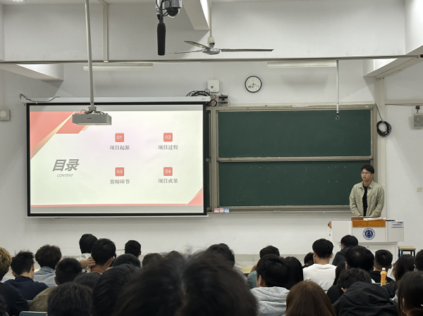 应剑同学从项目负责人的角度出发讲述团队成长和发展的故事,分享了参加 “挑战杯”“振兴杯”等各类比赛的感悟,具体介绍了团队协作、创新突破、自我提高和视野开拓等方面的心路历程。并以“有善始者繁,能克终者盖”“所有的恐惧都来源于火力不足”为结语,鼓励同学们不忘初心、坚守信念,不懈奋斗、永葆干劲。